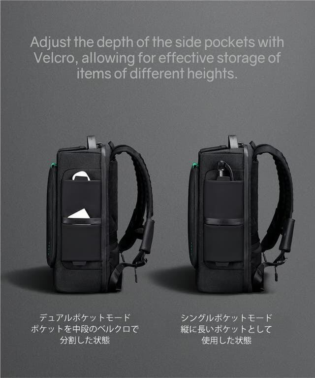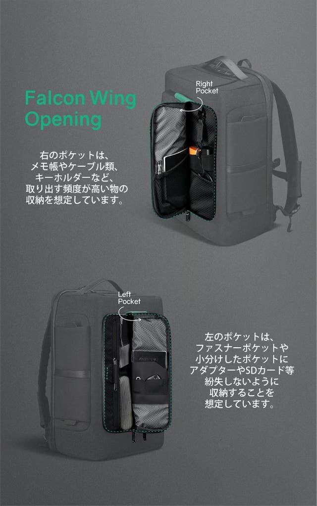 【観音開きする正面ポケットが斬新!ポケットも多く配置してるので、使用頻度の高いアイテムを小分けできます】前面に配置された、観音開きのギミックが新しいクイックアクセス「ファルコンウイング」ポケットには、小分けされたポケットを多く配置し、デイリーなものを体系的に効率よく収納することができます。