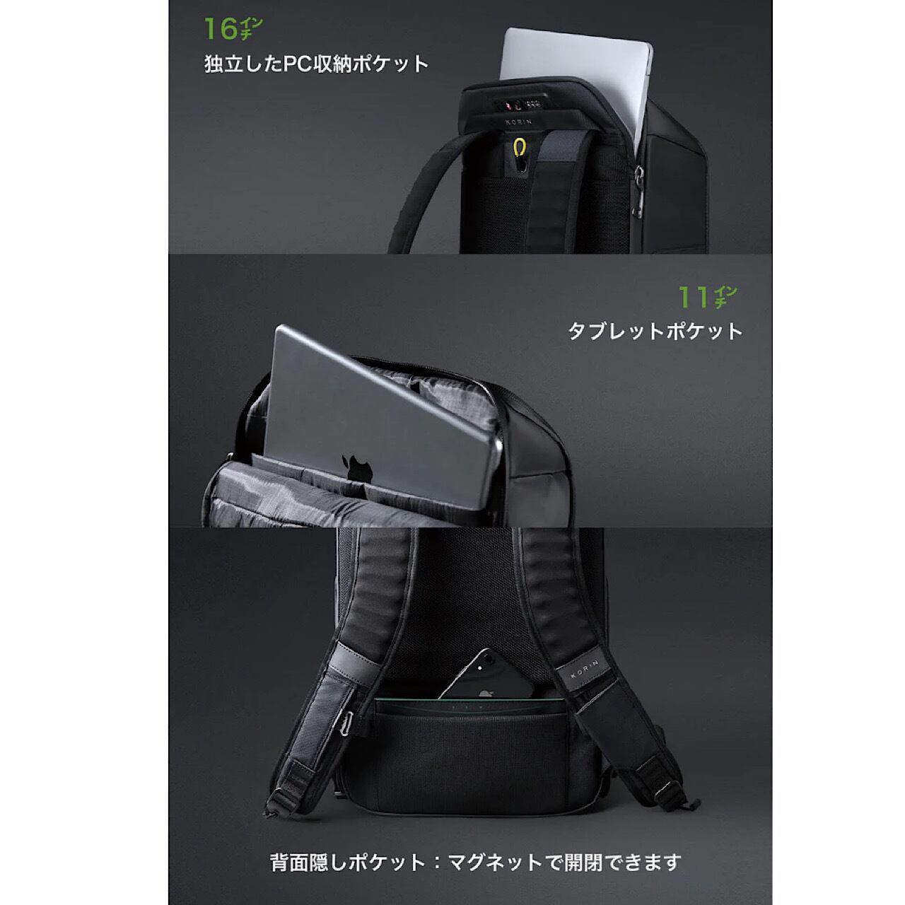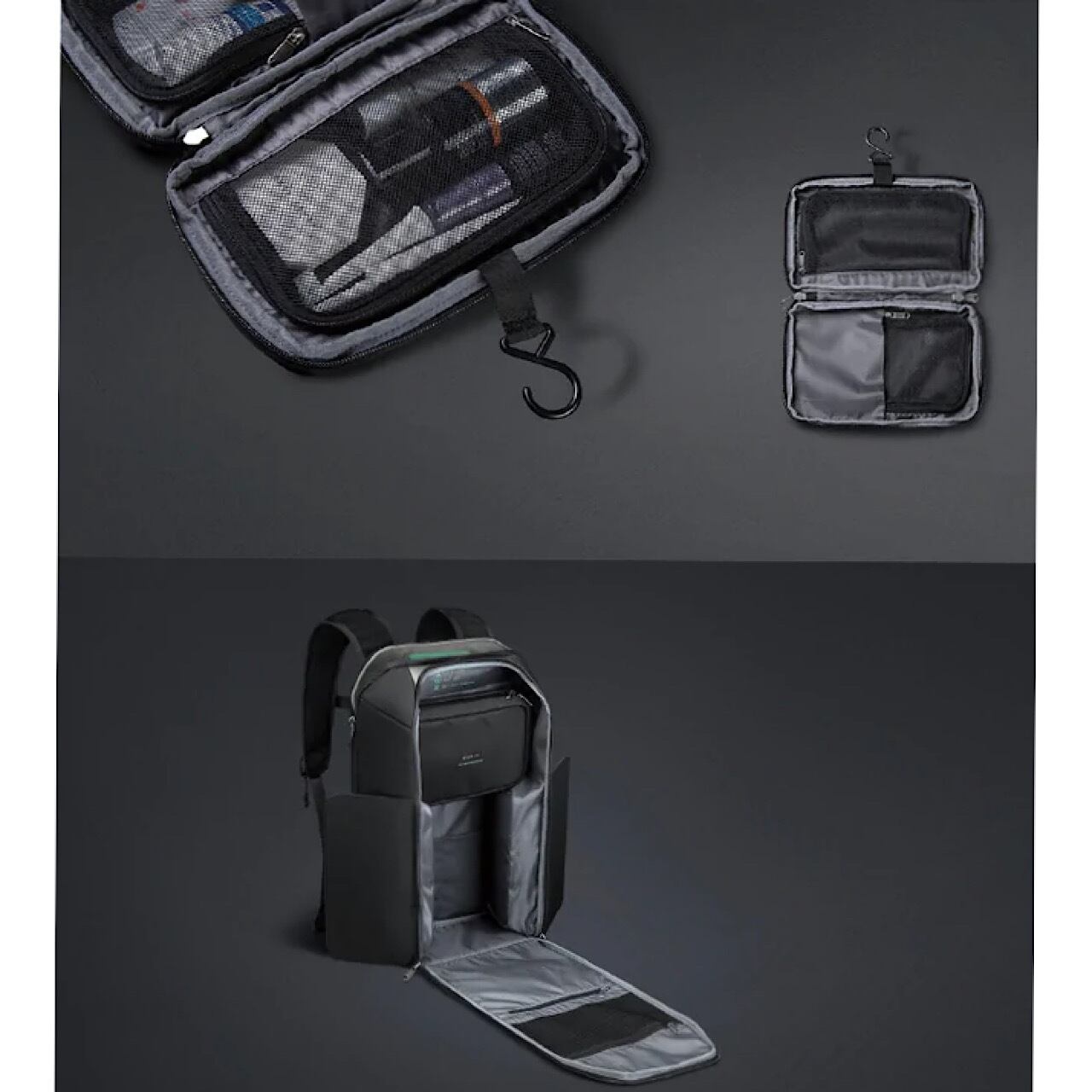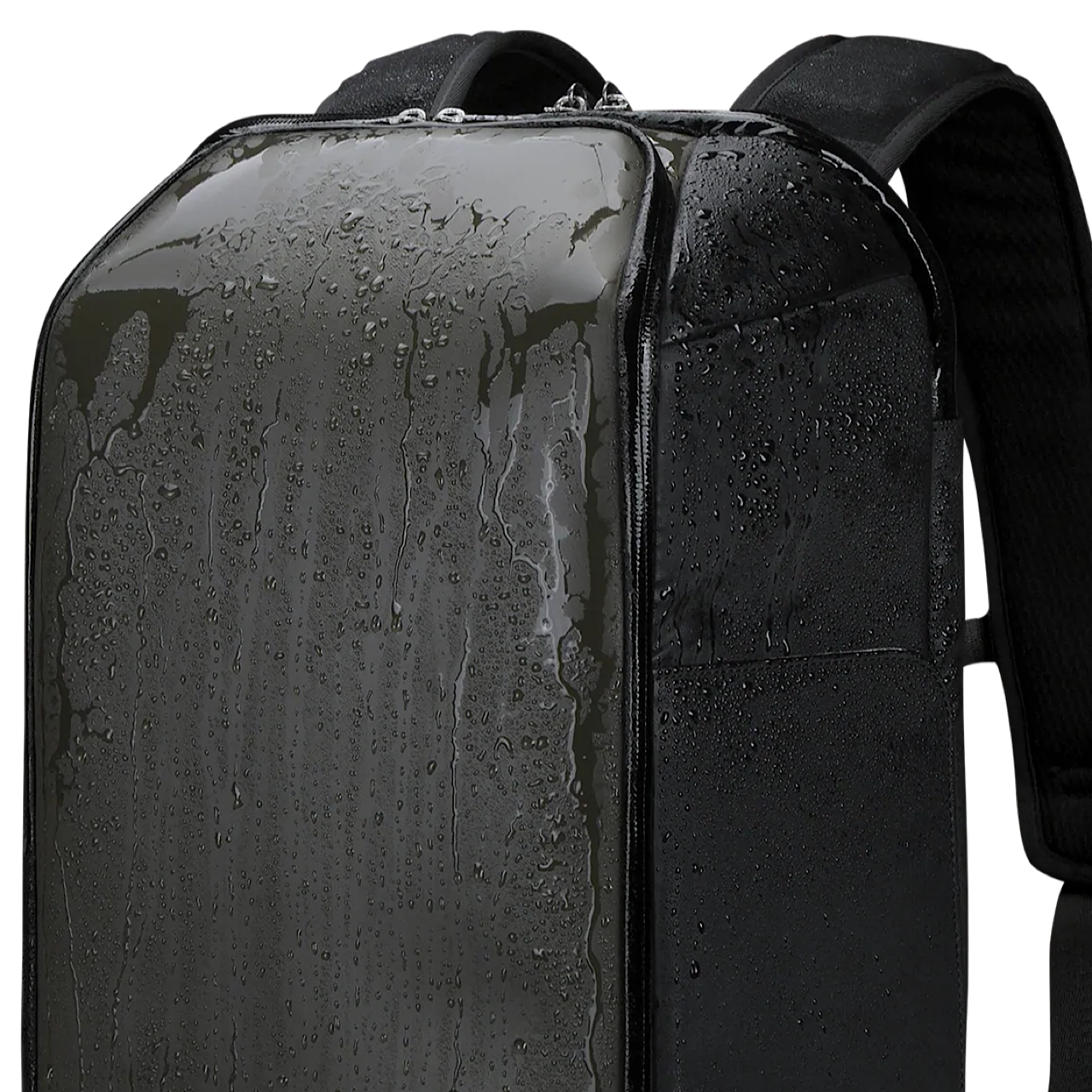 隠しポケットとメインコンパートメントは水に強い生地で区分けされており、使用済みの傘や水滴のついたペットボトルをお入れいただくこともできます。