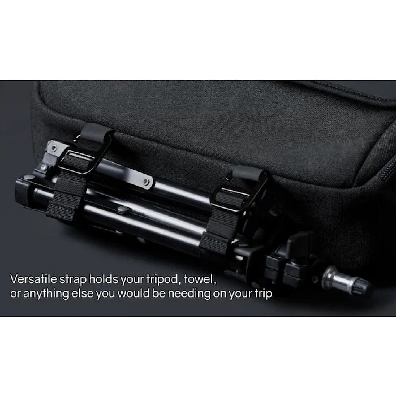 ClickSling Xの隠れ機能として、底部にボトルや傘などを取り付けることが出来る拡張ベルトを搭載しています。ストラップはグルっと円周で25センチ程度のものまで対応可能です。